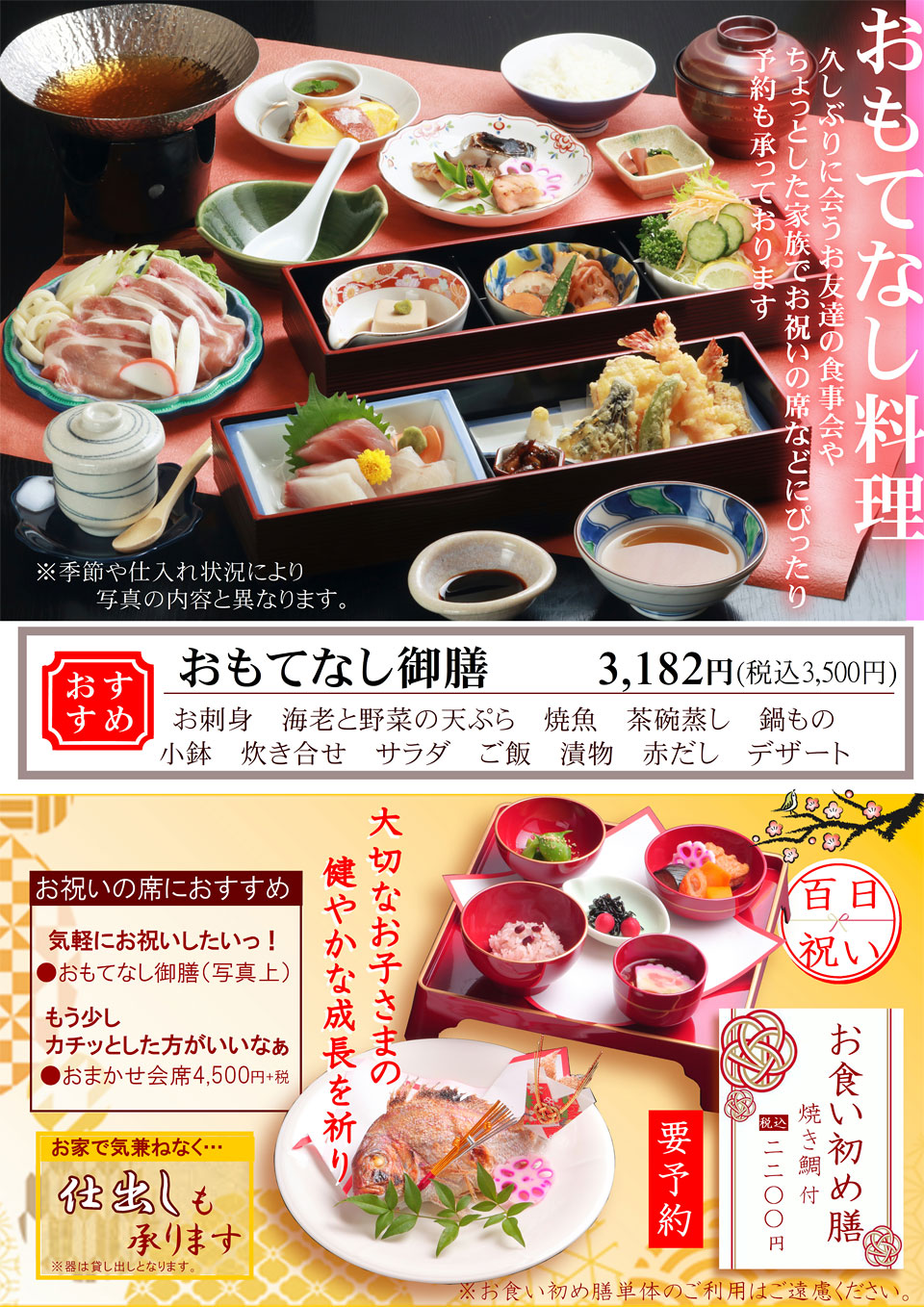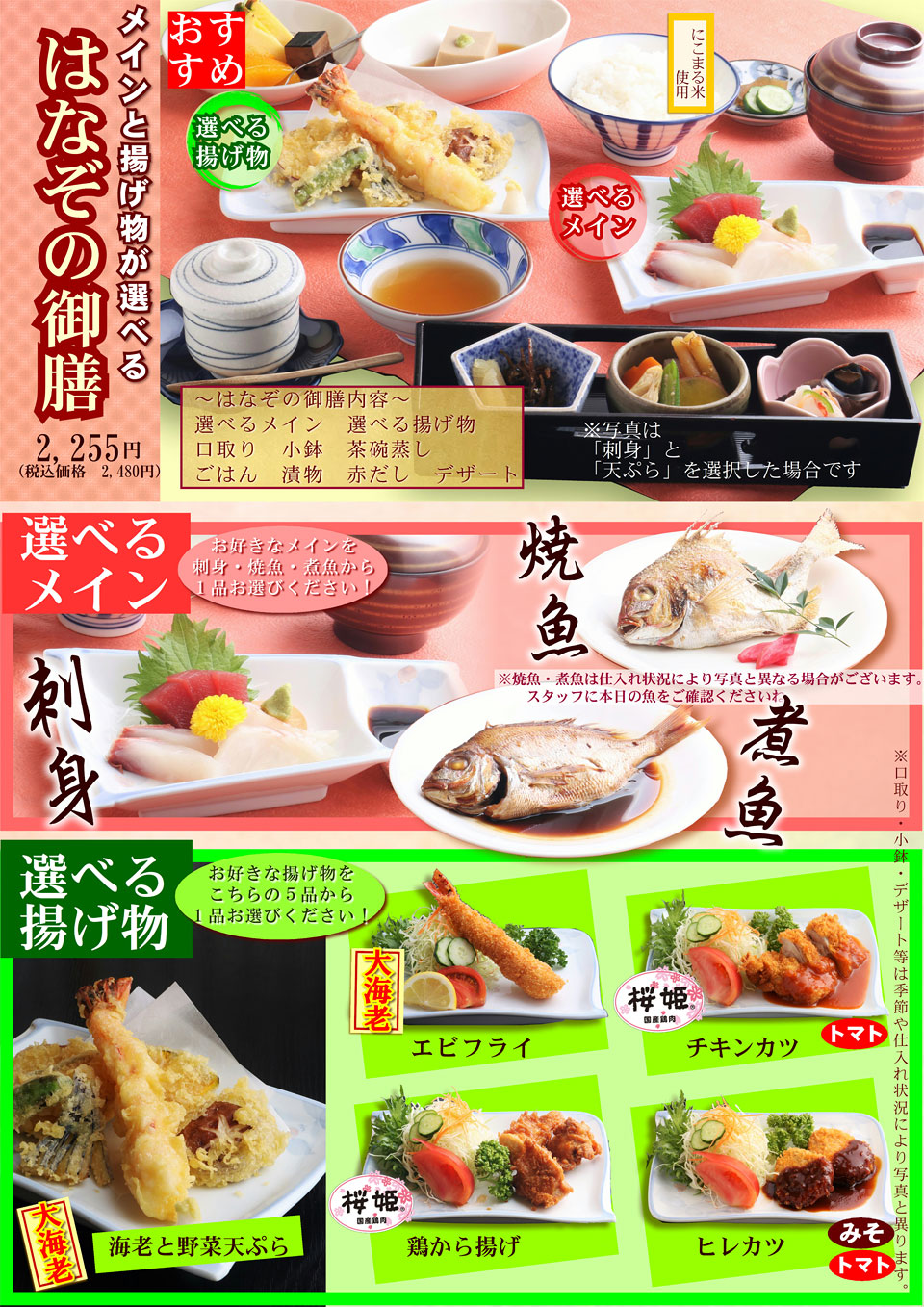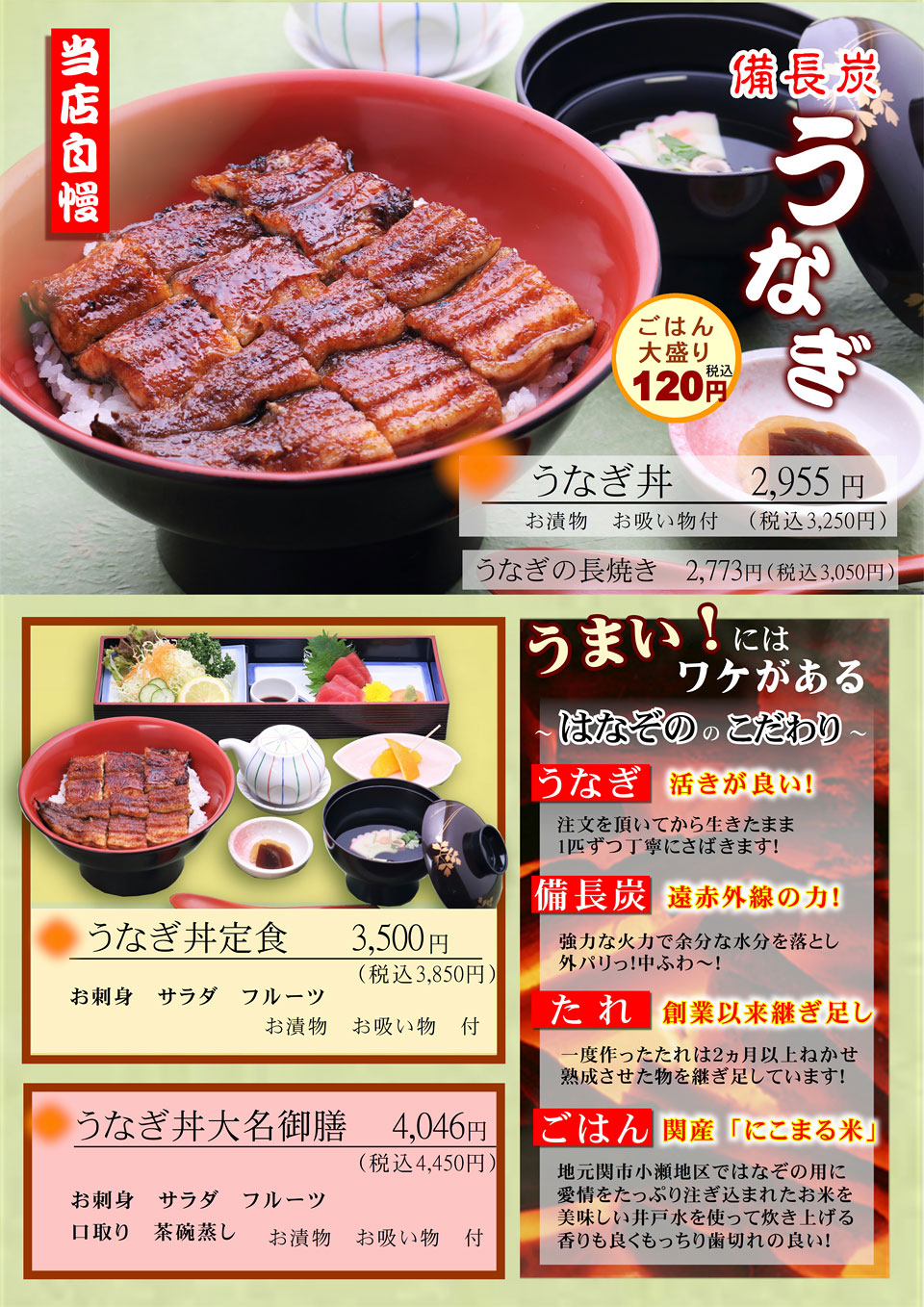 ・おもてなし御膳、はなぞの御膳、うなぎ料理での