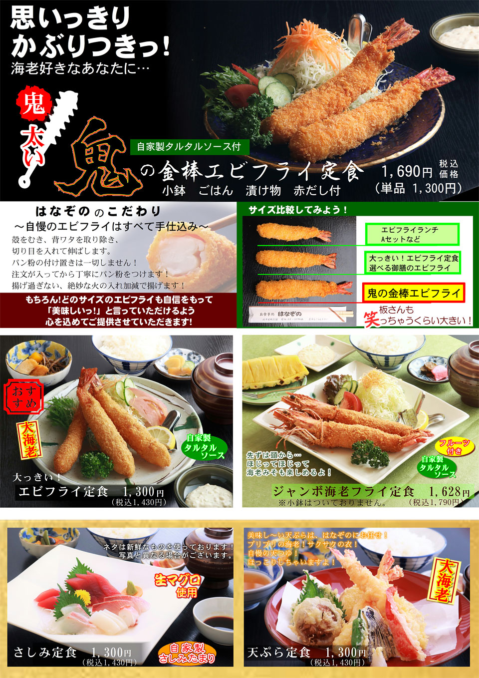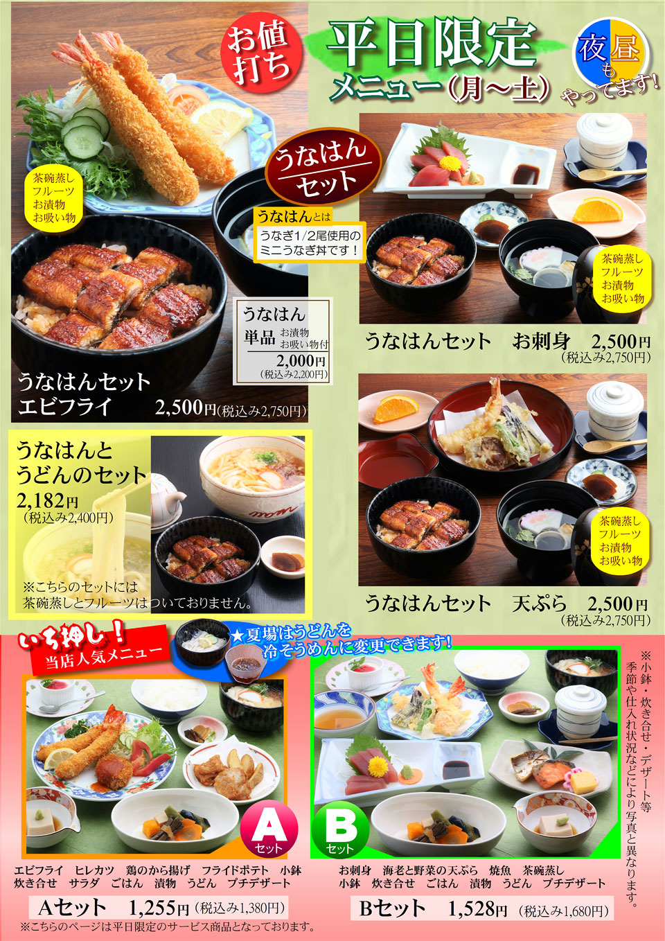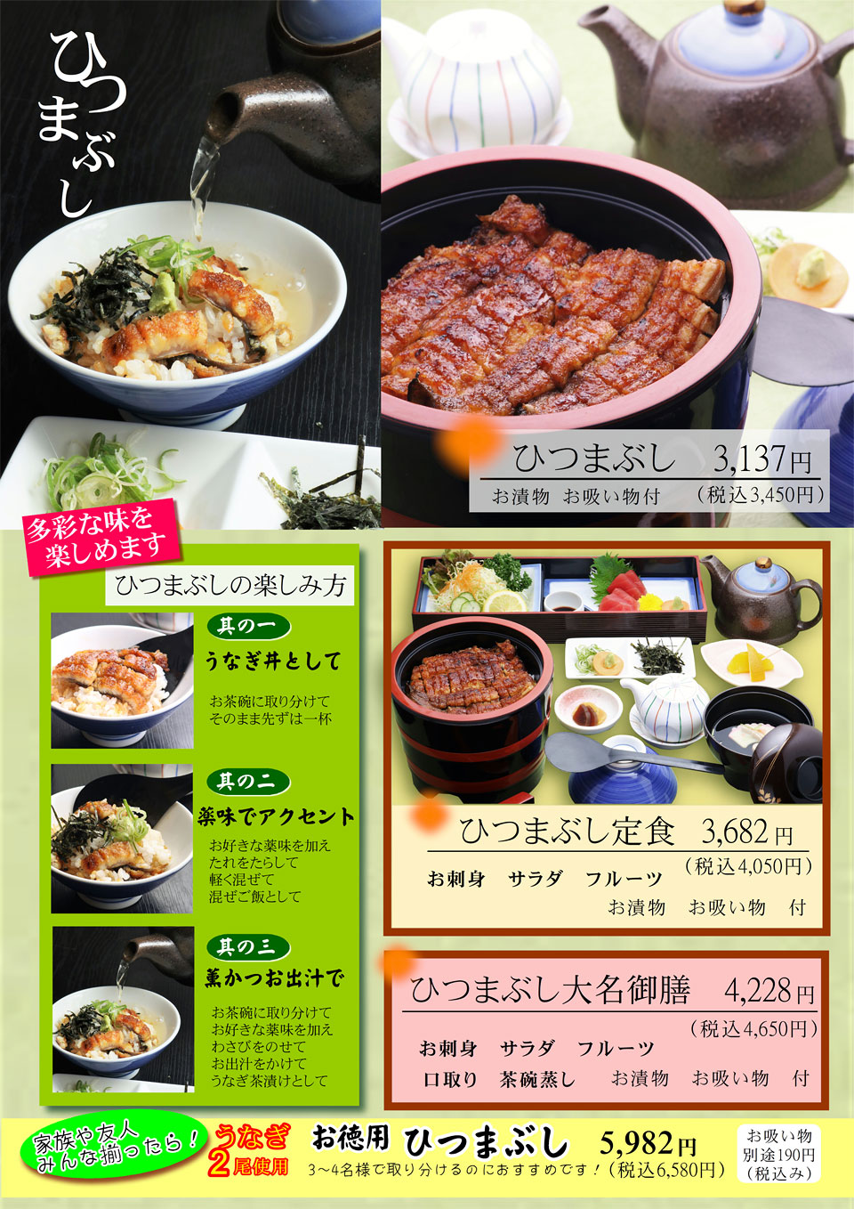 ・おもてなし御膳、はなぞの御膳、うなぎ料理での