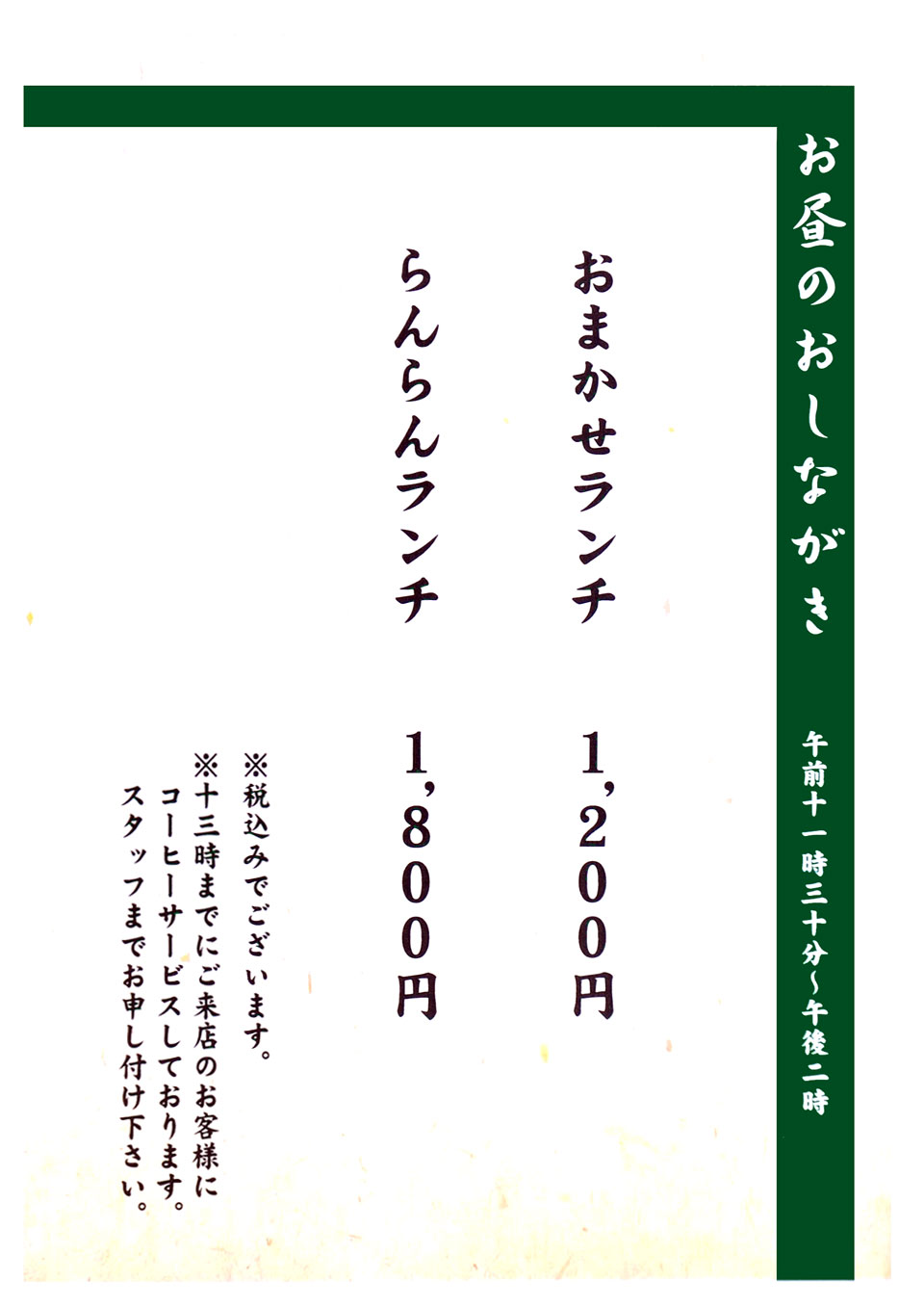 | 【特典】お楽しみサービスあり(HPを見たとお伝えください) |